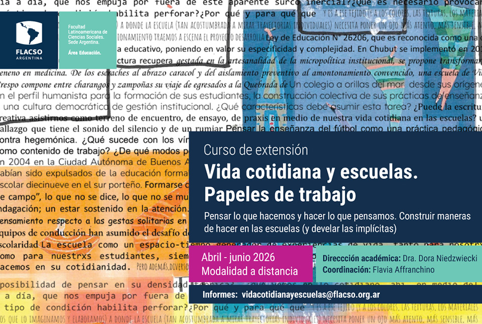 El Programa Políticas, Lenguajes y Subjetividades en Educación (PLYSE) del Área Educación de FLACSO Argentina abre la inscripción a un nuevo curso de extensión: Vida cotidiana y escuelas. Papeles de trabajo. Dirigido por la Dra. Dora Niedzwiecki y coordinado por Flavia Affranchino orientado a reflexionar colectivamente sobre las prácticas cotidianas en las instituciones educativas y las condiciones que hacen posible pensar la tarea pedagógica en el contexto actual.
